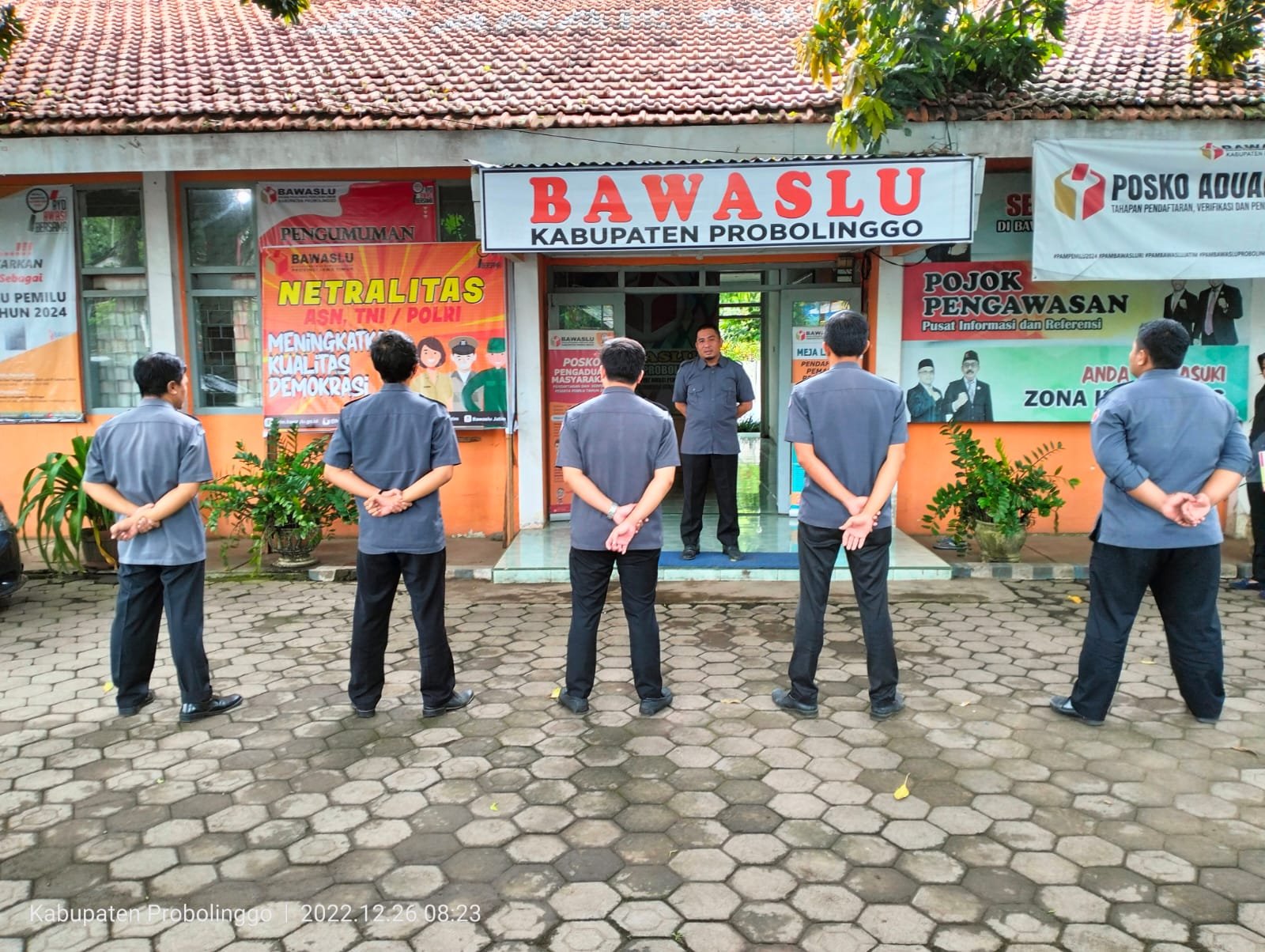 Kraksaan - Bertempat di Halaman Kantor Bawaslu Kabupaten Probolinggo tepat pukul 08:00 WIB, Purwanto selaku Bendahara Pelaksana Pembantu (BPP) Bawaslu Probolinggo menjadi pembina apel pagi sekaligus memimpin doa yang diikuti oleh jajaran sekretariat Bawaslu Kabupaten Probolinggo, Senin (26/12).