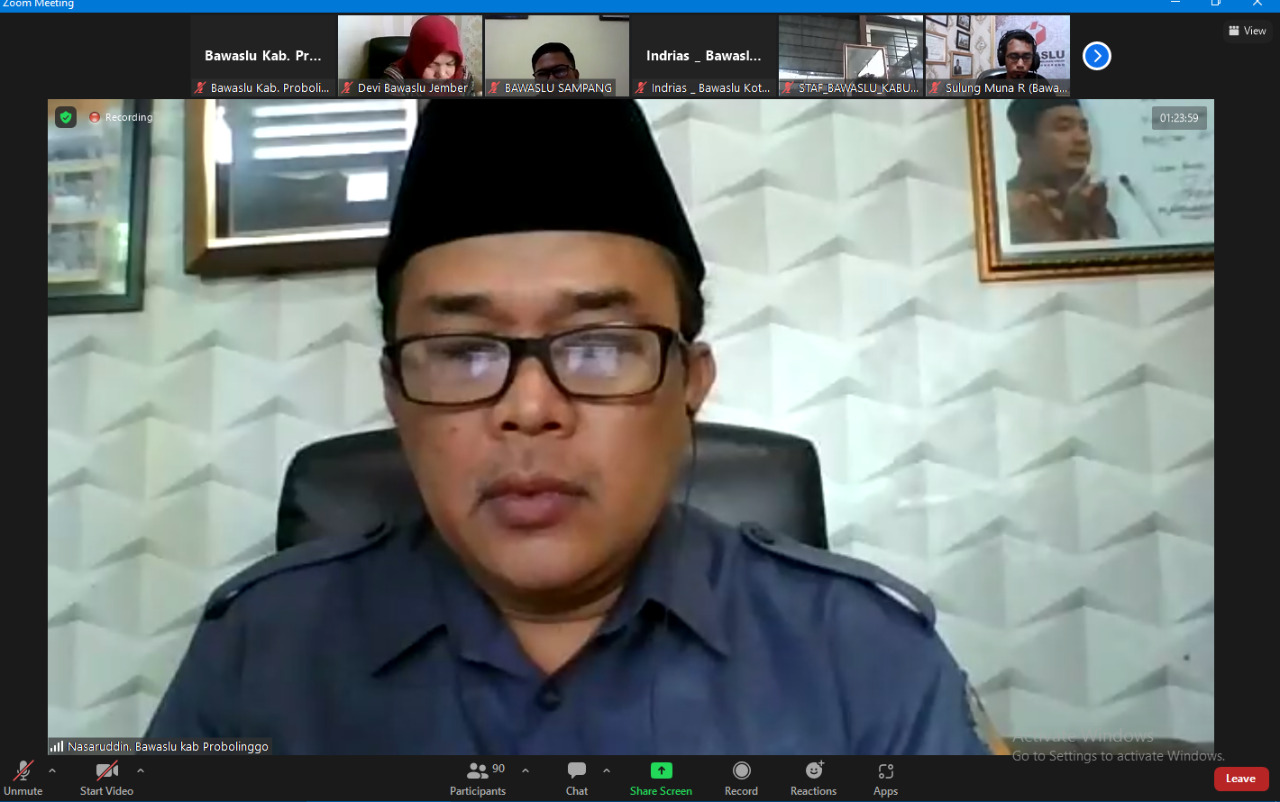 Dalam kesempatan diskusi ini Koordinator Divisi Hukum, Humas dan Data Informasi Bawaslu Probolinggo Ahmad Nasaruddin Latief hadir sebagai narasumber wakil dari kelompok satu, dan narasumber Pungki Dwi PuspitoI (Bawaslu Kabupaten Tulungagung), Indrias Kristiningrum (Bawaslu Kota Mojokerto), Suhariyanto (Bawaslu Kabupaten Blitar), Sulung Muna Rimbawani (Bawaslu Kabupaten Ponorogo) Agus Hariyanto (Bawaslu Kabupaten Pacitan) yang dipandu oleh Devi Aulia Rahim (Bawaslu Kabupaten Jember) sebagai moderator.