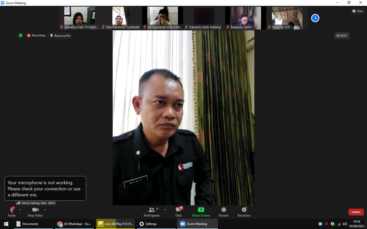 Probolinggo – Hari ini Bawaslu Kabupaten Probolinggo Mengikuti Rapat Daring Diskusi internal Koordinasi Permohonan Dukungan atas Inovasi Pelatihan Kepemimpinan Nasional Tingkat 1 a.n Dr. La Bayoni, S.IP, M.Si (Deputi Bidang Dukungan Teknis Bawaslu RI). Acara dilaksanakan pada Hari Jumat tanggal 3 Juni 2022 diikuti oleh seluruh Bawaslu se-Jawa Timur.