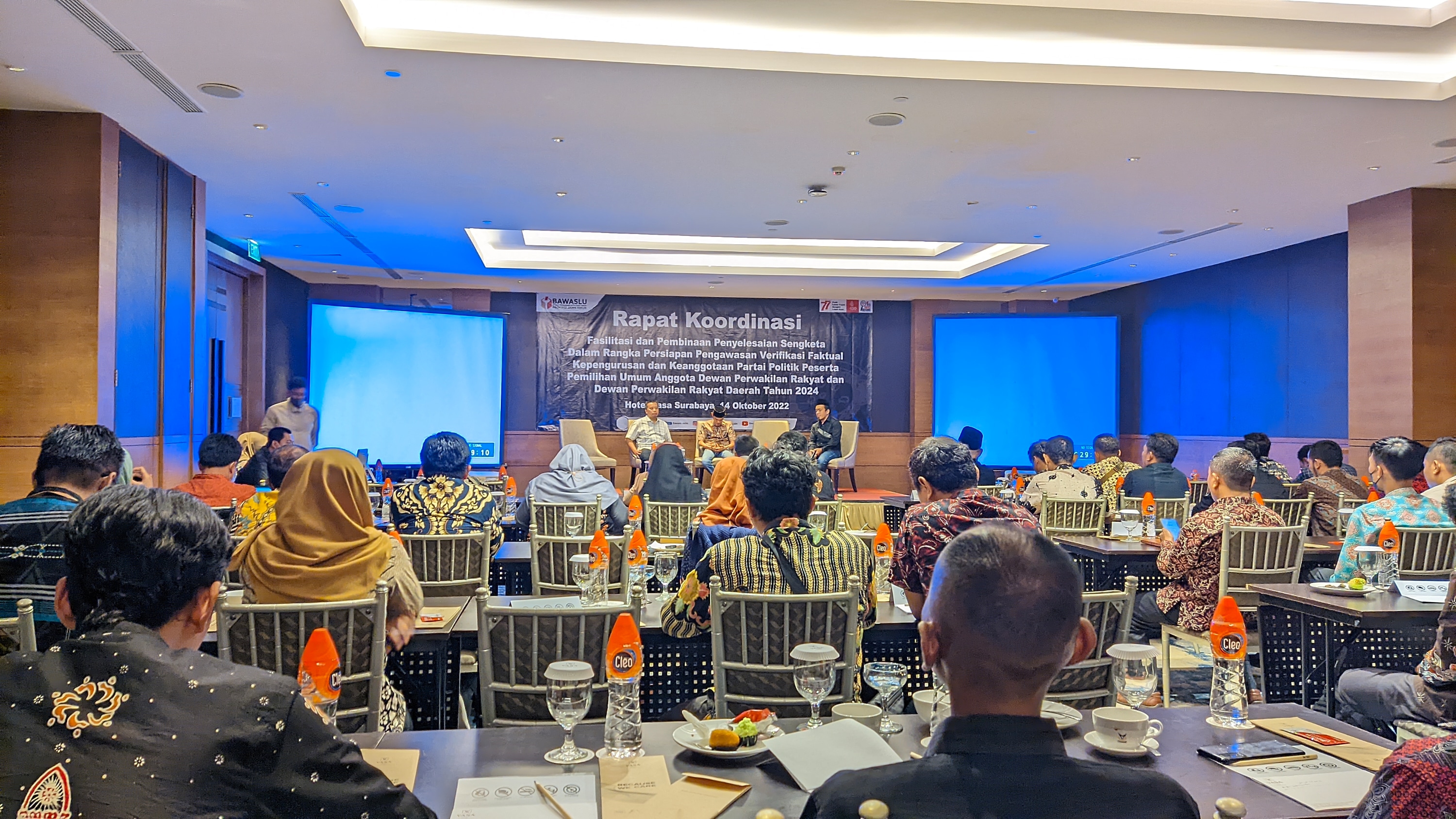 Surabaya - Bawaslu Kabupaten Probolinggo hadiri Acara rapat koordinasi fasilitasi dan pembinaan penyelesaian sengketa dalam rangka persiapan pengawasan verifikasi faktual kepengurusan dan keanggotaan partai politik peserta pemilu anggota DPR dan DPRD tahun 2024 bertempat di Hotel Vasa Surabaya ( 14/10/2022).