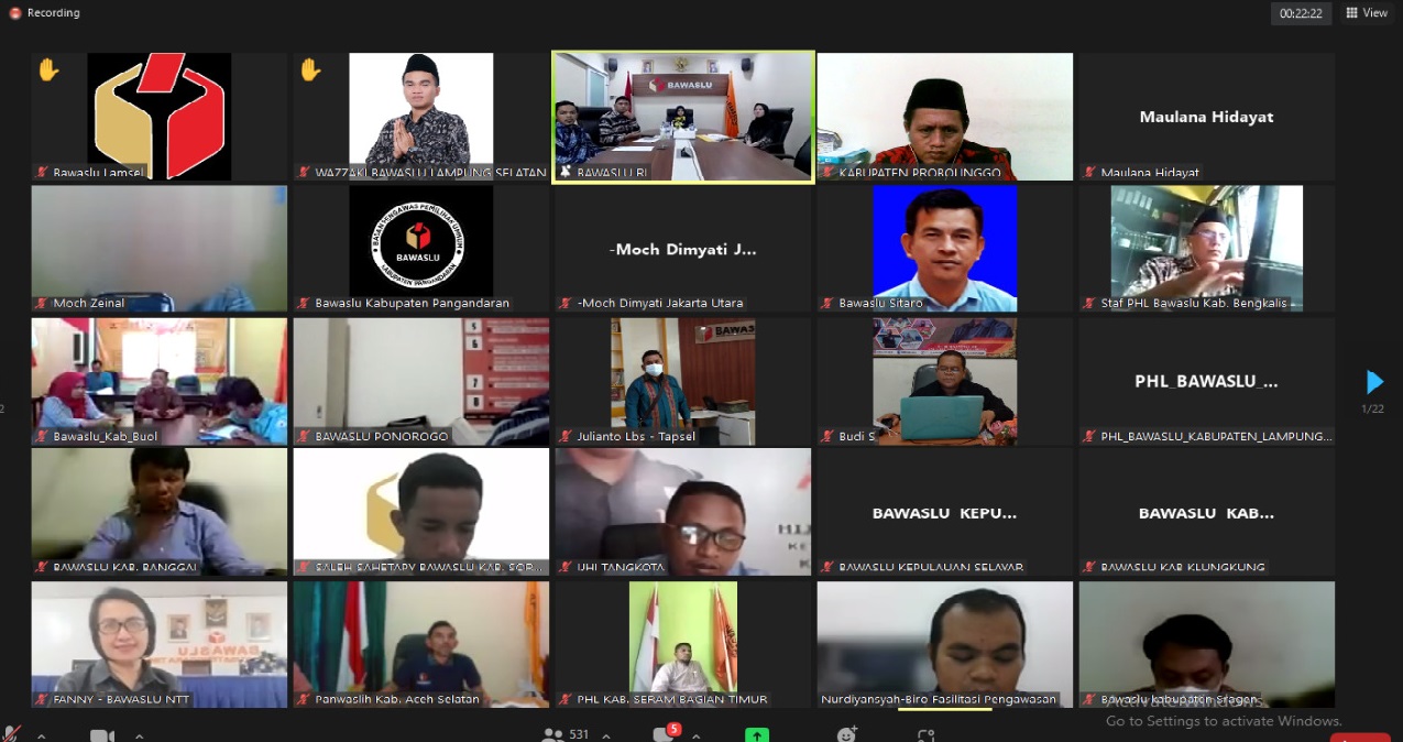 Peserta rapat adalah Bawaslu Provinsi dan Bawaslu Kabupaten/Kota seluruh Indonesia. Rapat secara daring tersebut dihadiri sebanyak 708 participan yang di mulai dari jam 13.00 sampai selesai.