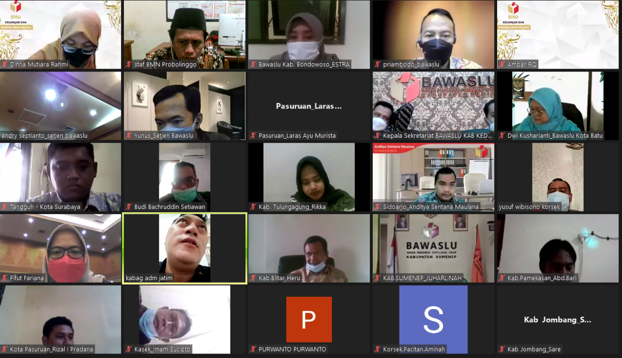 Rapat via zoom meeting tersebut dihadiri oleh Priambodo selaku Koordinator Sub Bagian BMN dan Keuangan Bawaslu Republik Indonesia, juga dihadiri oleh Pitut Fariana (PPSPM), Tri Adiyanto Baay (Kabag Administrasi), dan Rahmatullah (Operator BMN) Bawaslu Provinsi Jawa Timur. Adapun peserta dalam giat tersebut Kepala/Plt. Kepala/Koordinator Sekretariat Bawaslu Kabupaten/Kota se-Provinsi Jawa Timur tersebut. Yusuf Wibisono hadir dalam rapat tersebut selaku Koordinator Sekretariat Bawaslu Probolinggo.