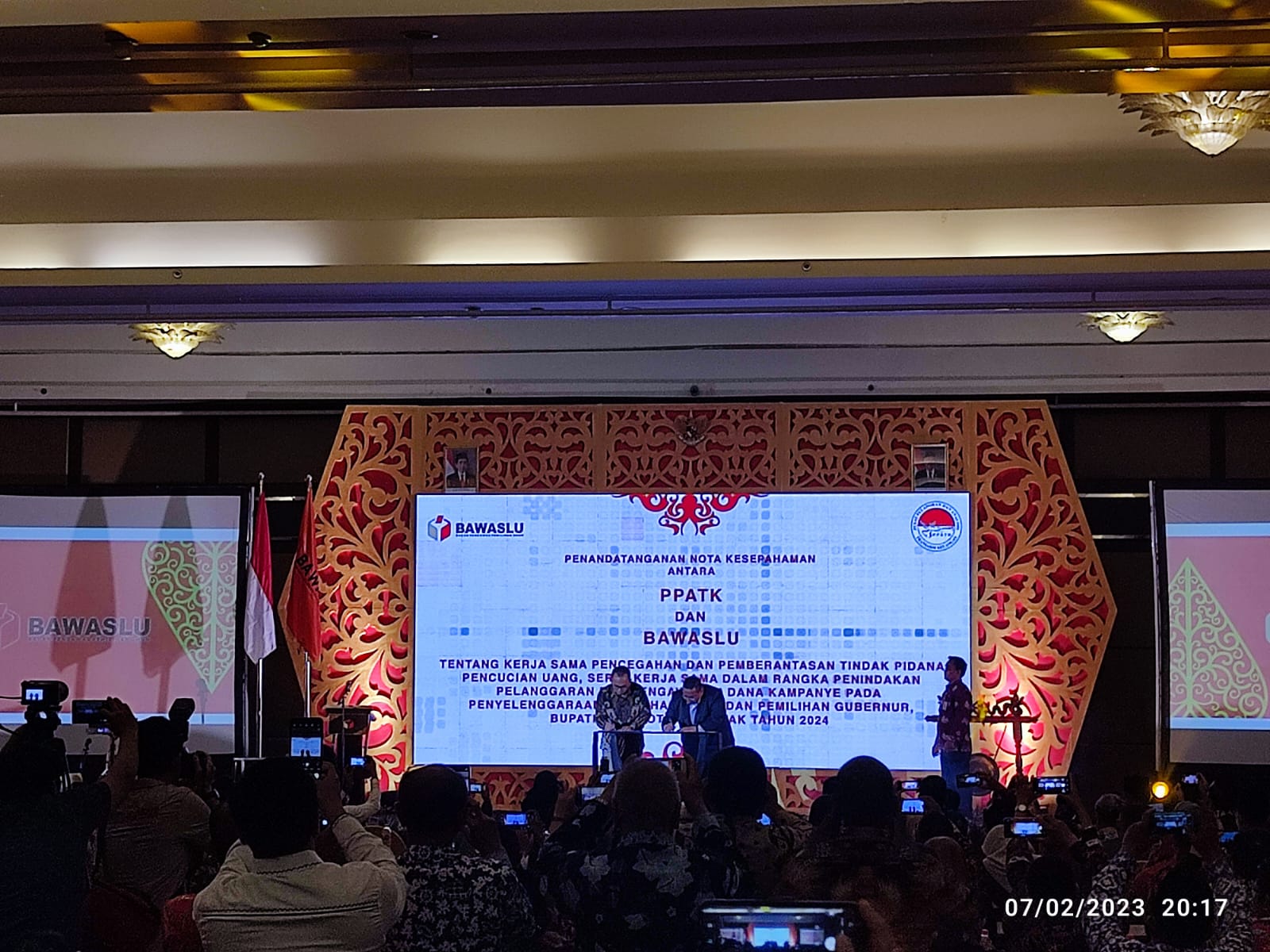 Surabaya – Pada Selasa (7/2) Bawaslu menjalin Memorandum Of Understanding (MoU) dengan Pusat Pelaporan dan Analisis Transaksi Keuangan (PPATK) yang dilakukan di Hotel Whyndam Surabaya di sela sela Rapat Koordinasi Nasional Pencegahan Pelanggaran Dan Pengawasan Tahapan Pemutahiran Penyusunan Daftar Pemilih Tetap Pemilu 2024.