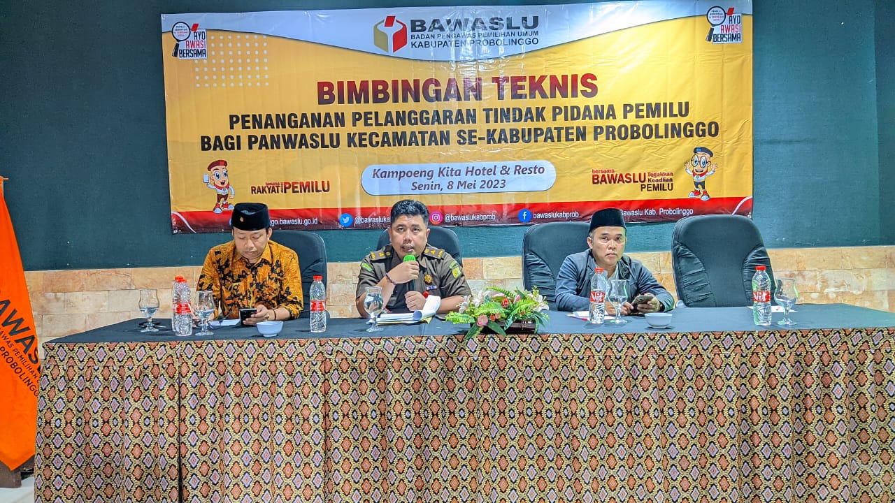 Probolinggo - Dalam rangka meningkatkan kapasitas dalam penanganan pelanggaran Panitia Pengawasan Pemilu Kecamatan, Bawaslu Kabupaten Probolinggo menggelar Bimbingan Teknis Penanganan Pelanggaran Tindak Pidana Pemilu Bagi Panwascam bertempat di Kampoeng Kita Hotel dan Resto pada Senin, 8 Mei 2023. Dalam sambutan pembukanya, Ketua Bawaslu Kabupaten Probolinggo, Fathul Qorib menjelaskan akan banyak dinamika dalam pelaksanaan tahapan pemilu. Bahkan pada saat tahapan pendaftaran DPR, DPRD Provinsi, dan DPRD Kabupaten/Kota dimulai dari pendaftaran peserta, pendaftaran calon, kampanye, hingga pemungutan suara maupun pada tahapan lainnya.