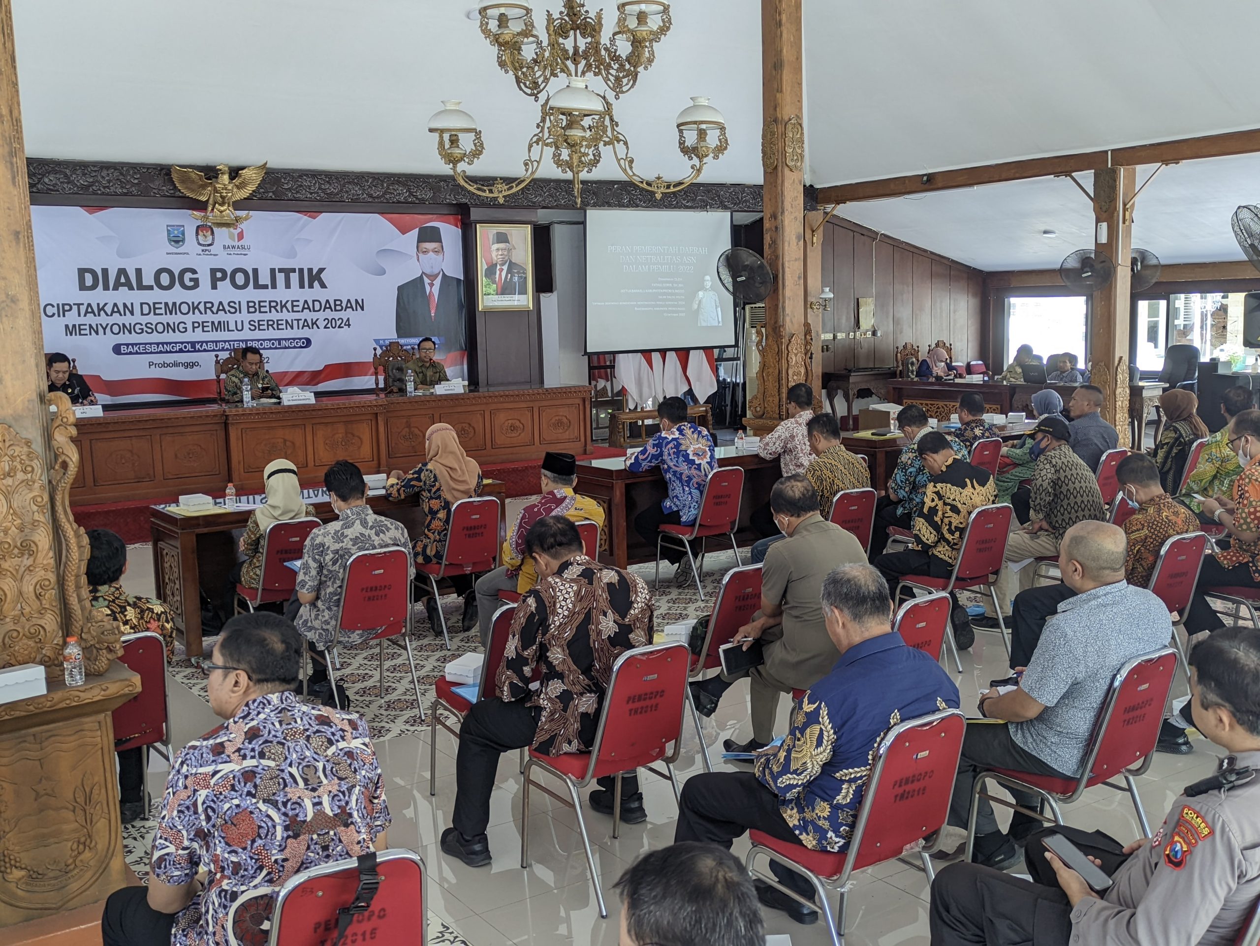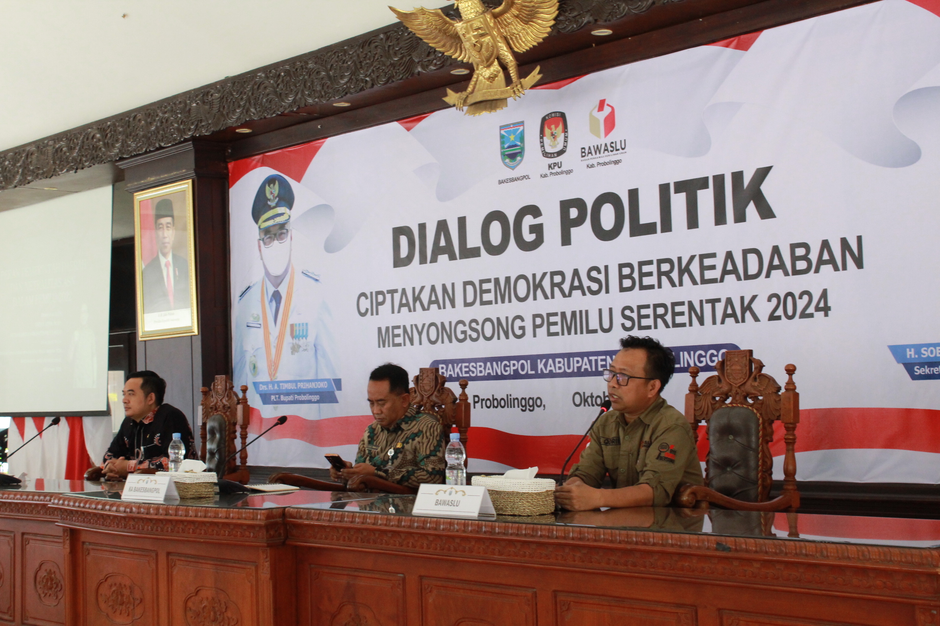 Kota Probolinggo - Bawaslu Probolinggo bekerja sama dengan Bakesbangpol dan KPU gelar Dialog politik ciptakan demokrasi berkeadaban menyongsong pemilu serentak 2024 (13/10/2022).