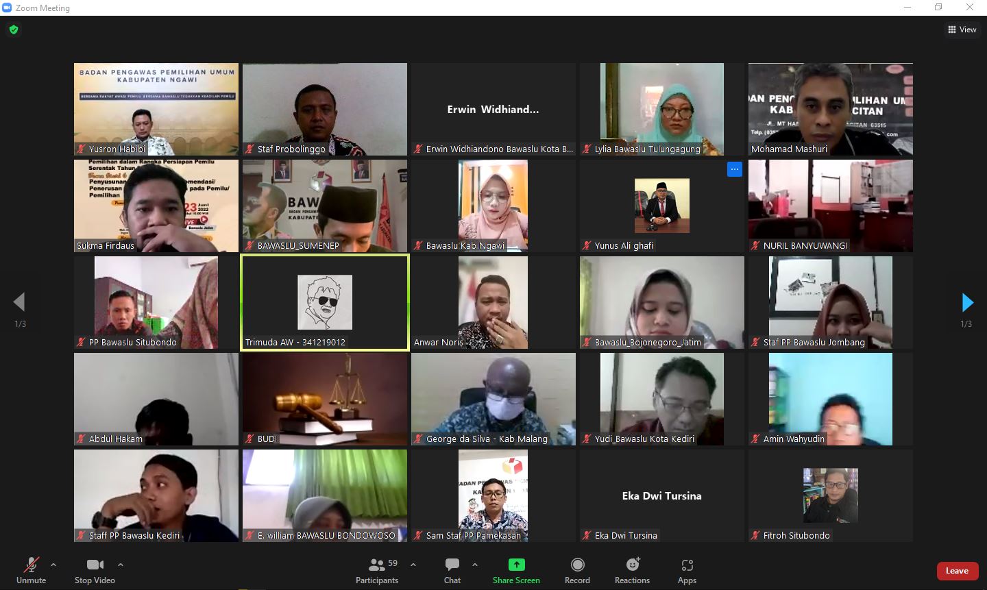 Probolinggo – Hari ini (23/06) Diskusi internal pendalaman Penanganan Pelanggaran Pemilu/Pemilihan seri ke-6 yang dilaksanakan seminggu sekali tepatnya setiap hari Kamis kali ini mengangkat tema “Penyusunan-Penyampaian/Penerusan Dugaan Pelanggaran Pada Pemilu/Pemilihan” yang masih tetap melalui Zoom Meeting.