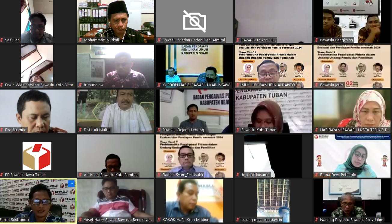 Probolinggo – Diskusi penegakan hukum Pemilu seri 4 yang diadakan oleh Divisi Penanganan Pelanggaran Bawaslu Provinsi Jawa Timur kali ini mengangkat tema “Problematika Pasal-Pasal Pidana dalam Undang-Undang Pemilu dan Pemilihan”. Seperti diskusi-diskusi sebelumnya acara digelar secara virtual (Zoom Metting) dimulai pukul 14.00 WIB. Fathul Qorib hadir sebagai Koordinator Divisi Penanganan Pelanggaran Bawaslu Probolinggo, Muh. Ikhwanudin Alfianto Anggota Bawaslu Jatim sebagai pemantik diskusi dan Fitriyanto, ST. Anggota Bawaslu Situbondo sebagai moderator. Kamis (2/12/2021)