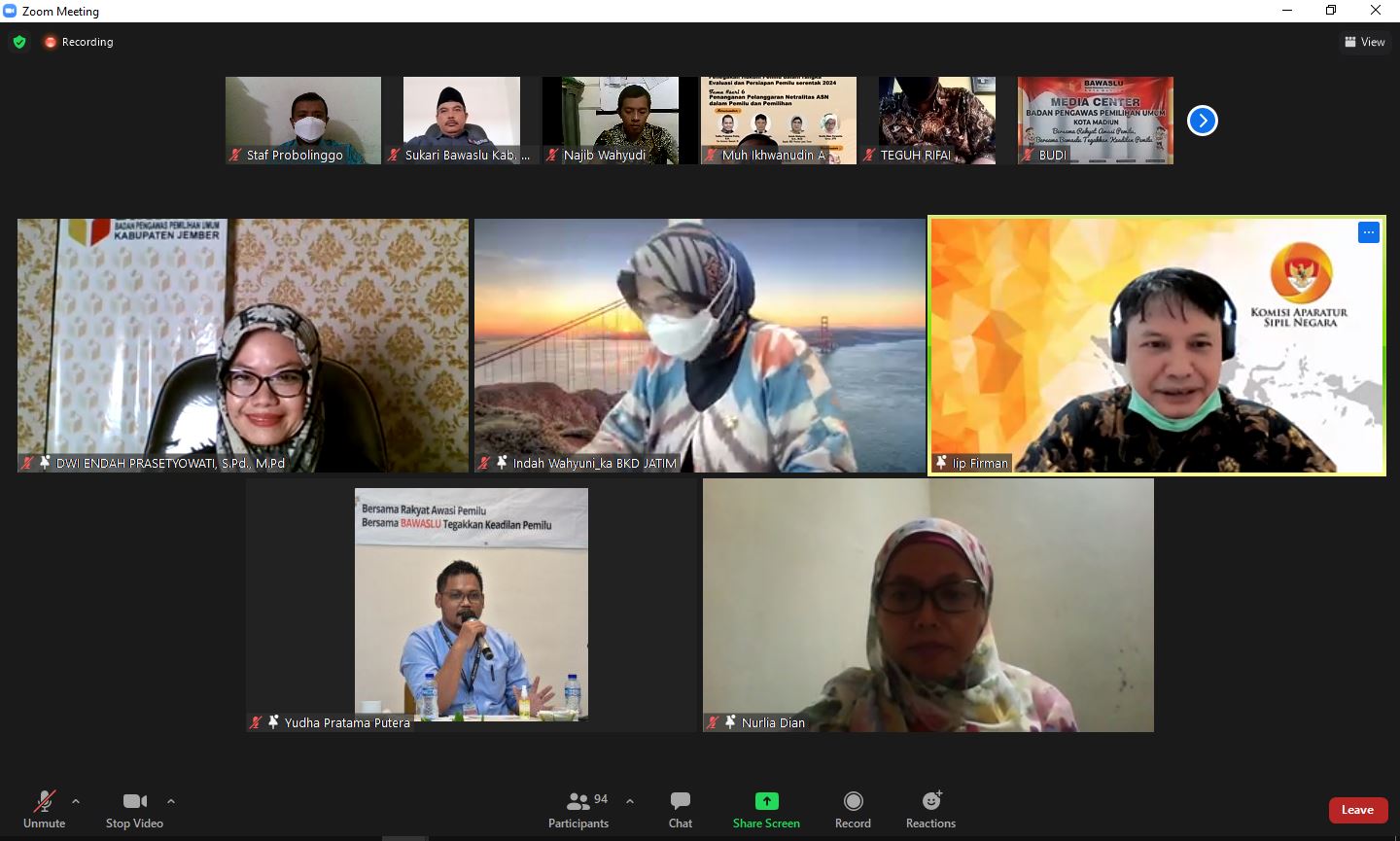 Probolinggo – Diskusi Penegakan hukum Pemilu seri 6 yang digagas oleh Divisi Penanganan Pelanggaran Bawaslu Provinsi Jawa Timur kali ini mengangkat tema “Penanganan Pelanggaran Netralitas ASN dalam Pemilu dan Pemilihan”. Diskusi yang dilaksanakan secara virtual (Zoom Metting) tersebut dimulai pukul 07.30 WIB dengan peserta Koordinator Divisi Penanganan Pelanggaran Bawaslu Kabupaten/Kota se-Provinsi Jawa Timur, untuk Bawaslu Probolinggo diwakili oleh Fathul Qorib selaku Koordinator Divisi Penanganan Pelanggaran. Pemantik diskusi seperti pada seri-seri sebelumnya yaitu Muh. Ikhwanudin Alfianto Anggota Bawaslu Jatim dan Dwi Endah Prasetyowati Anggota Bawaslu Jember sebagai moderator. Kamis (16/12/2021)