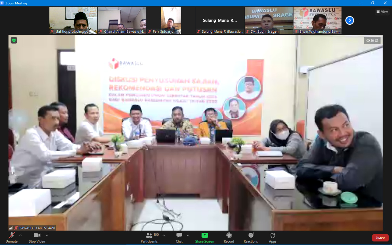 Kegiatan ini dilaksanakan dicenter meting Bawaslu Kabupaten Ngawi yang diikuti oleh bawaslu kabupaten dan kota se-jawa timur dan diikuti pula oleh peserta dari luar daerah. Pelaksanaan kegiatan dimulai dari jam 09.00 hingga selesei secara virtual zoom meting. Diskusi ini diikuti oleh Nazaruddin Latif , S.H, M.Pd anggota Bawaslu Kabupaten Probolinggo pemangku divisi Hukum Humas Data dan Informasi beserta staff.