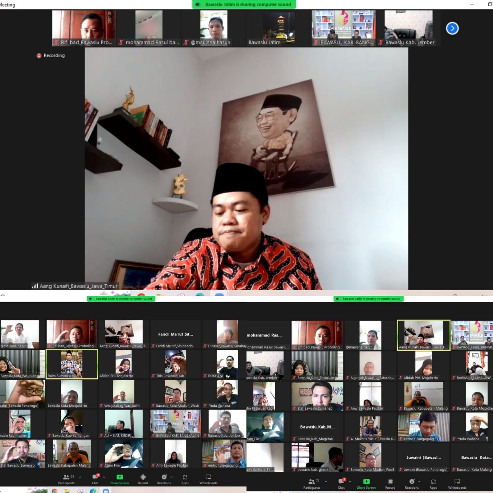 Rapat daring ini diikuti oleh Koordinator Divisi Pengawasan & Hubungan Antar Lembaga (PHL) Bawaslu Kabupaten/Kota se-Jawa Timur. Turut hadir Kordiv Pengawasan & Sosialisasi Bawaslu Provinsi Jawa Timur Aang Kunaifi, Kabag Pengawasan Wesley S, serta tim asistensi Maulana Hasun.