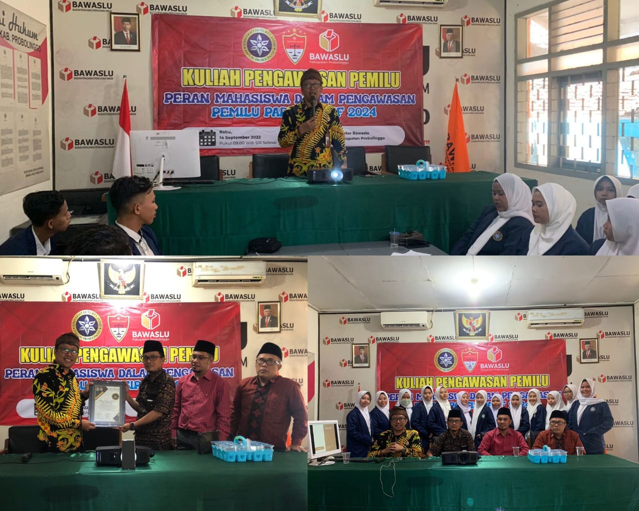 Pesan ini disampaikan di ruang pertemuan Kantor Bawaslu Probolinggo (14/09/2022) saat acara kuliah Pengawasan bagi Mahasiswa program studi Ilmu Hukum Fakultas Sosial dan Humaniora Universitas Nurul Jadid dengan peserta sekitar 30 (tiga puluh) lebih yang didampingi oleh Ketua prodi Mushafi Miftah dan rekan Syeiruddin.