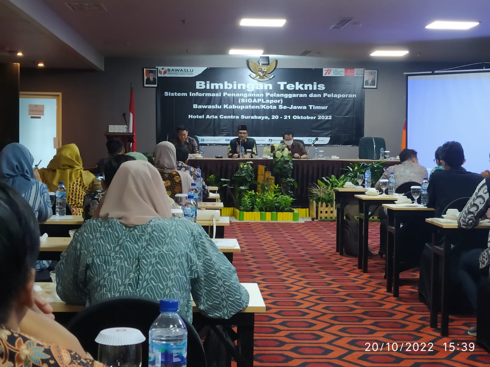 Surabaya - Kamis 20 Oktober 2022, bertempat di Hotel Aria Centra Surabaya, Jl. AIS Nasution, Genteng Surabaya, Bawaslu Kabupaten Probolinggo menghadiri acara Bimbingan Teknis Sistem Informasi Penanganan Pelanggaran dan Pelaporan (aplikasi SIGAP Lapor) bagi Bawaslu Kabupaten/Kota se-Jawa Timur, yang dilaksanakan oleh Bawaslu Provinsi Jawa Timur.