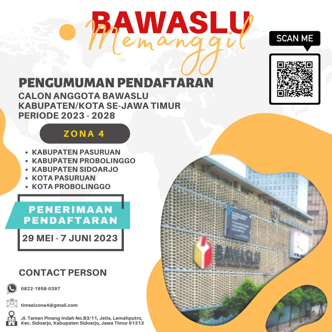 Dalam rangka pembentukan Bawaslu Kabupaten/Kota Provinsi Jawa Timur Zona 4 (Kabupaten Pasuruan, Kabupaten Probolinggo, Kabupaten Sidoarjo, Kota Pasuruan, Kota Probolinggo) Tahun 2023, maka Tim Seleksi Calon Anggota Bawaslu Kabupaten/Kota Provinsi Jawa Timur Zona 7 berdasarkan Keputusan Bawaslu Nomor 176/HK.01.01/K1/05/2023 atas kewenangan yang diberikan oleh Undang-Undang Nomor 7 Tahun 2017 tentang Pemilihan Umum membuka kesempatan bagi Warga Negara Indonesia yang memenuhi persyaratan untuk mendaftarkan diri sebagai calon anggota Bawaslu Kabupaten/Kota Provinsi Jawa Timur Tahun 2023. Adapun ketentuan pendaftaran adalah sebagai berikut: