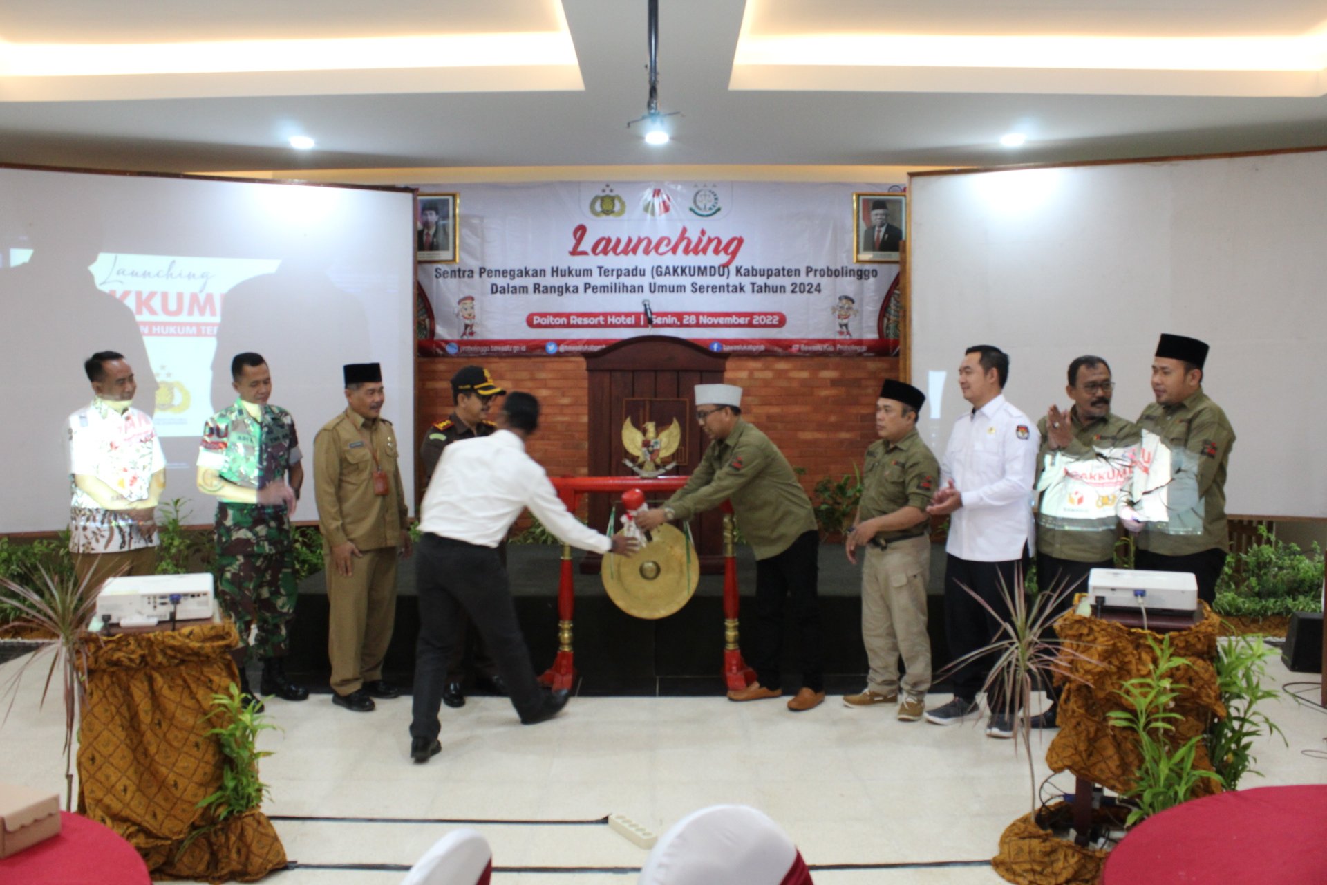 Paiton - Pukulan gong menandai di luncurkannya Sentra Gakkumdu Kabupaten Probolinggo. peluncuran sentra gakkumdu ini dalam rangkaian Launching Penegakan Hukum Terpadu (Gakkumdu) Kabupaten Probolinggo Dalam Rangka Pemilihan Umum Serentak Tahun 2024 Senin, (28/11) di Paiton Resort Hotel.