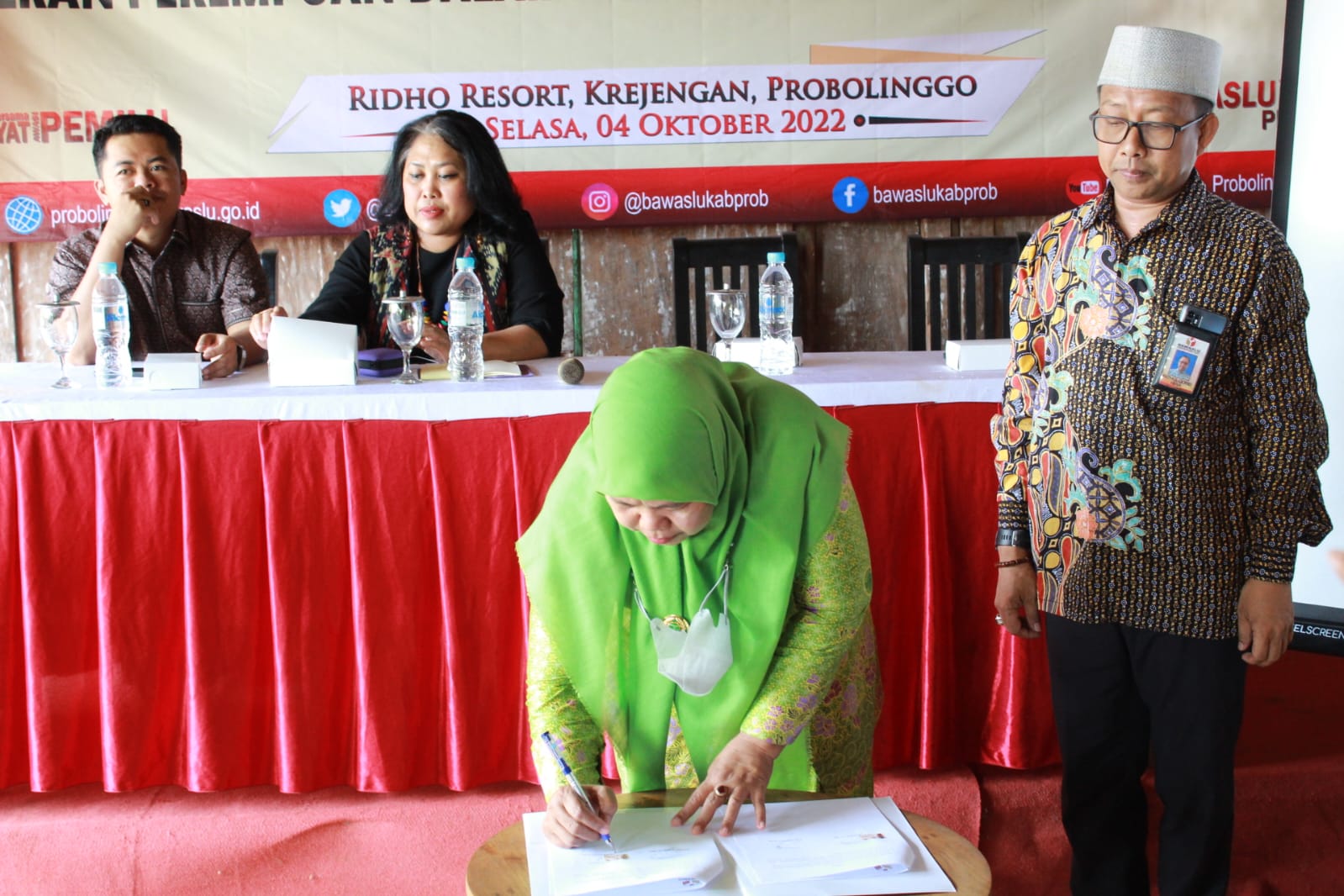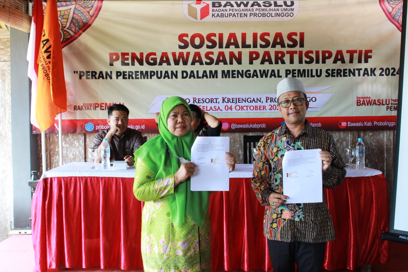 Acara penandatanganan kerjasama ini dilakukan saat Sosialisasi Pengawasan Partisipatif Peran Perempuan dalam Mengawal Pemilu Serentak 2024 sebagai peningkatan pemahaman kepemiluan terhadap kelompok perempuan yang bertempat di Aula Pertemuan Ridho Resort Krejengan, Kabupaten Probolinggo. (Humas).