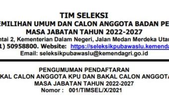 Tim Seleksi Calon Anggota KPU dan Calon Anggota Bawaslu Masa Jabatan Tahun 2022-2027 mengundang Warga Negara Indonesia terbaik untuk mendaftarkan diri menjadi Calon Anggota KPU dan Calon Anggota Bawaslu Masa Jabatan Tahun 2022-2027 sesuai dengan Undang-Undang Nomor 7 Tahun 2017 tentang Pemilihan Umu